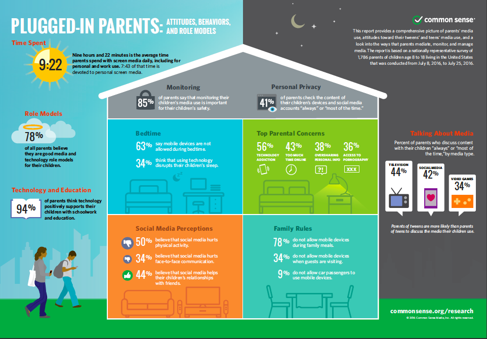 As illustrated by this graphic of parents’ technology use relative to that of teens, parental monitoring and talking about media with children is balanced with their own sizeable consumption of screen time and with modeling media behavior to children (Lauricella et al., 2016).