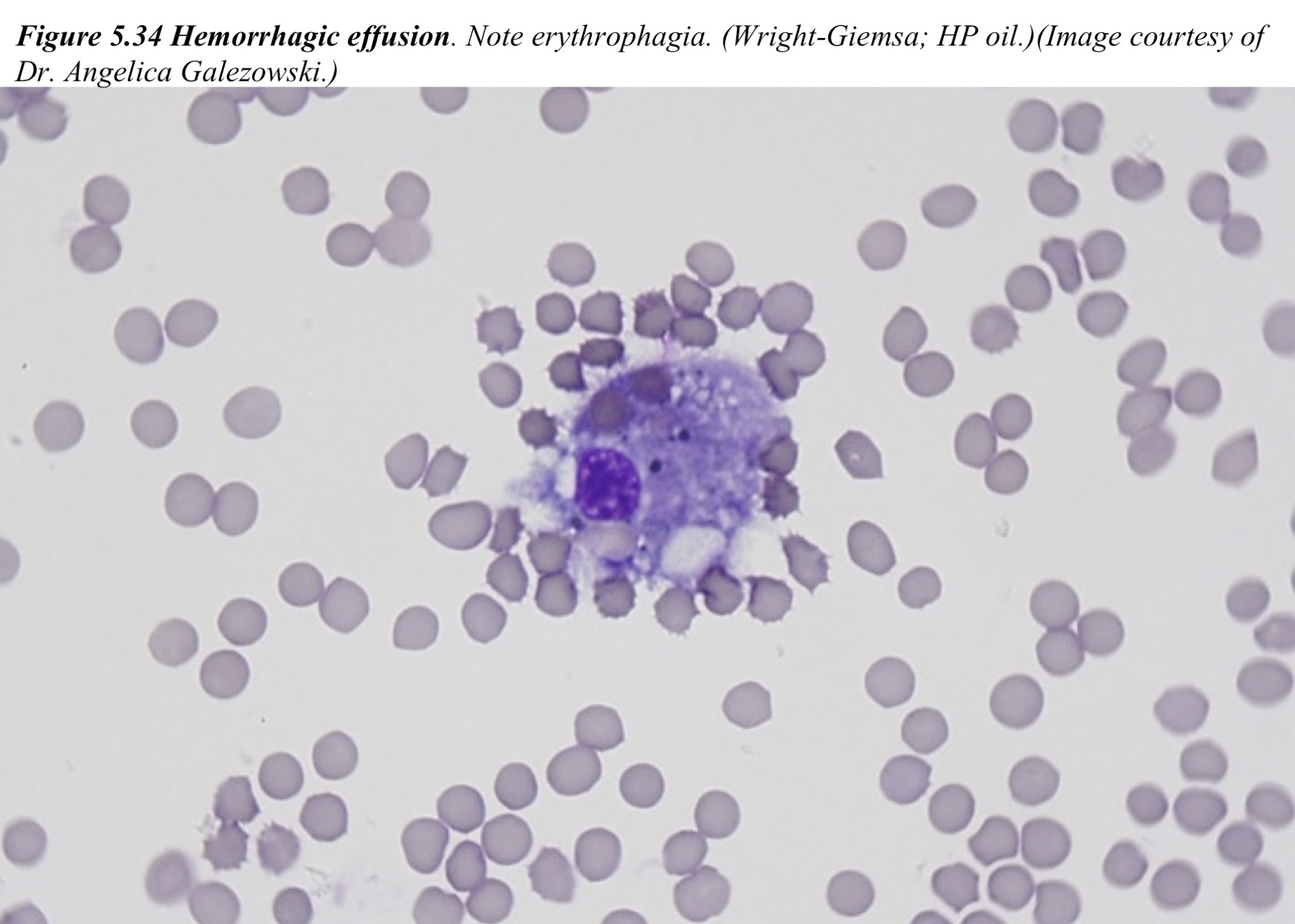 Hemorrhagic effusions have protein concentration and cell counts similar to peripheral blood. There are several causes of hemorrhagic effusions: trauma, surgery, coagulopathy, rupture of a damaged vessel, and rupture of a fragile, blood-filled tissue (such as ruptured hemangioma or hemangiosarcoma of the spleen). Contamination of the sample with peripheral blood can occur at the time of collection and should be differentiated from a true hemorrhagic effusion. Platelets lyse and disappear from hemorrhagic effusions within a few hours. Also, monocytes (and later, macrophages) begin to phagocytose erythrocytes within a few hours (Fig. 5.34). After several more hours, erythrocyte degradation results in the presence of hemosiderin within macrophages. In very long-standing hemorrhagic effusions, macrophages are the predominant cell type and abundant hemosiderin and possibly hematoidin crystals (bright yellow, rhomboid shaped crystals) will be noted.